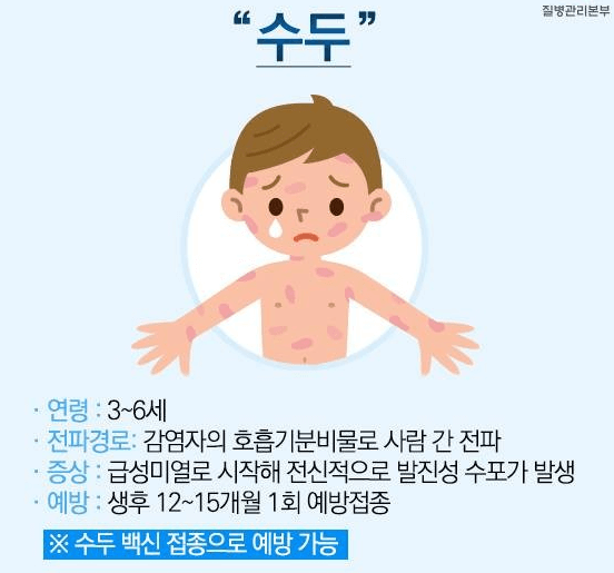수두는 요즘같은 봄철(4~6월)에 6세 이하 또는 초등학생들에게 발생되는 질병입니다. 피부에 발진을 유발시키는 바이러스에 의한 감염병이며, 높은 전염성을 가지고 있어서 직접 접촉이나 비말 감염에 의해 전파되기 때문에 조심해야 합니다. 이번에는 수두 증상과 치료방법에 대해서 살펴보겠습니다.